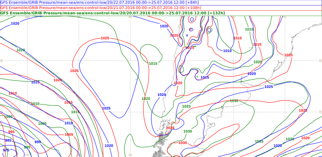 Las figuras anteriores muestran el análisis hecho para el modelo GFS en el campo de presiones en superficie, el ensamblado para la precipitación y la probabilidad de ocurrencia de la precipitación. Se puede ver que GFS si cambió aspectos en la presión (y probablemente lo hizo en otras variables también) en sus actualizaciones.