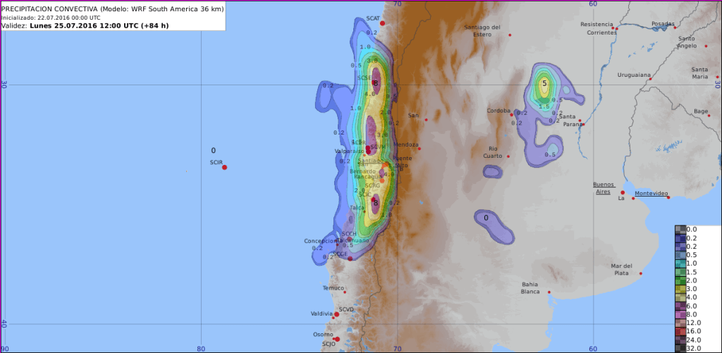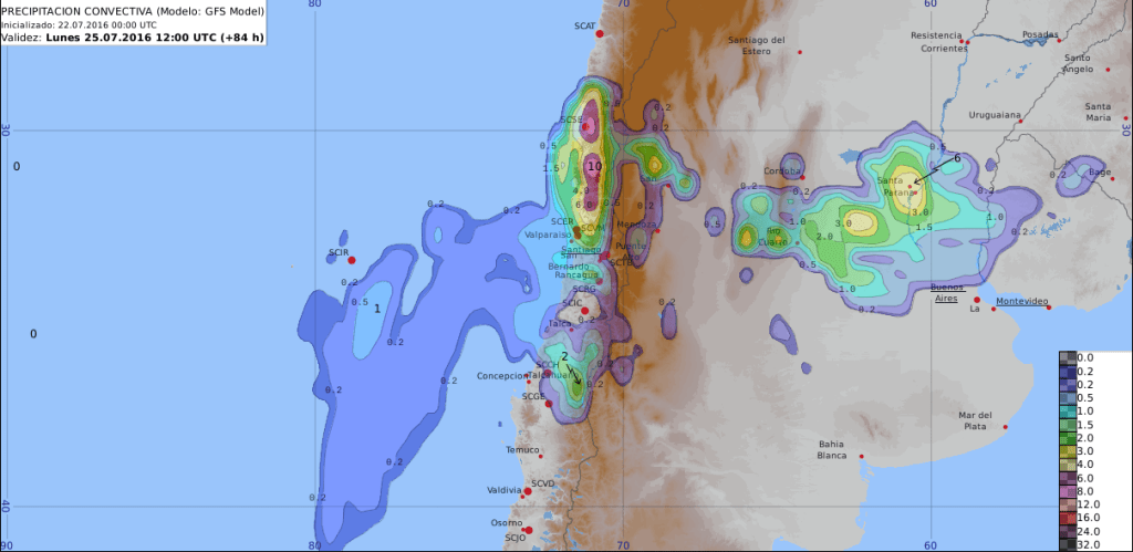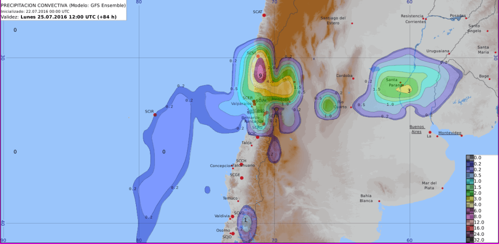 Las figuras anteriores se centran en Chile central para el día lunes 25. Si se fijan bien, las tres primeras imágenes corresponden a las tres imágenes mostradas en la primera galería. Eso no significa que tienen mayor resolución, sólo hice un zoom en un área de interés, tal como podría hacerlo en algún sitio de pronósticos o aplicaciones para celular (imágenes muy viralizadas en redes sociales).