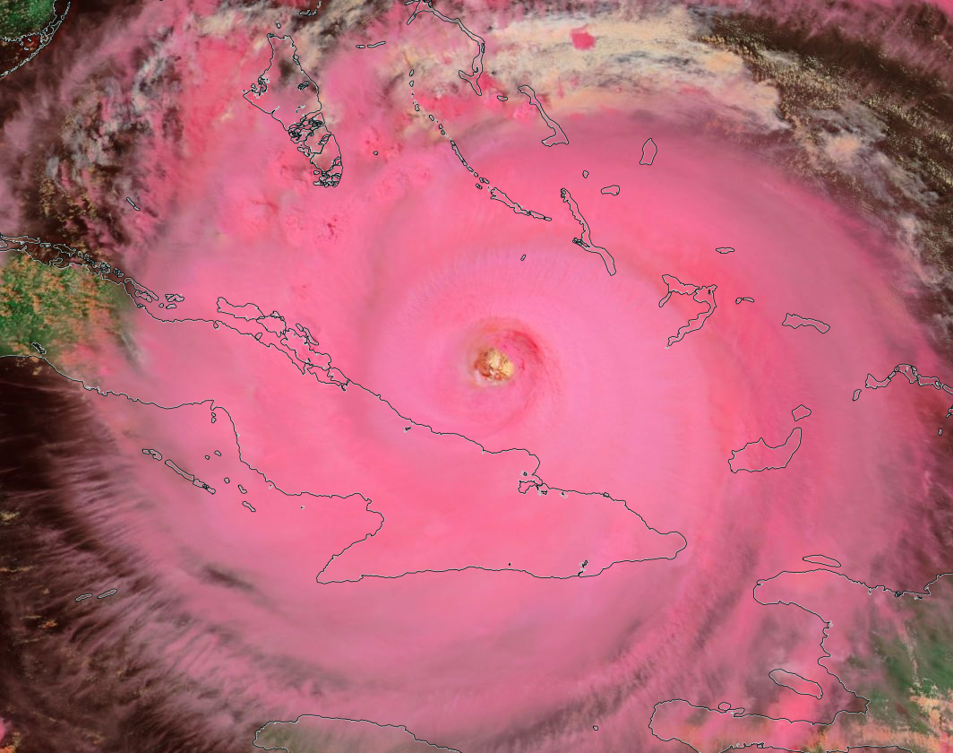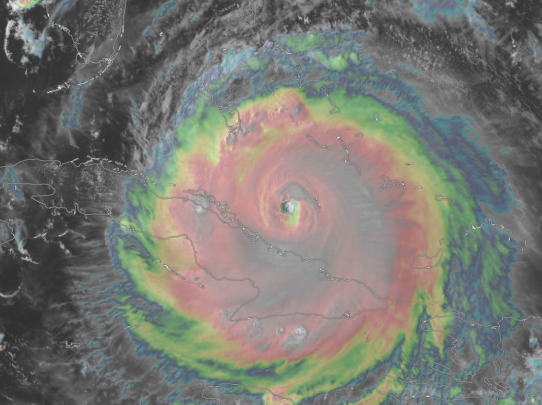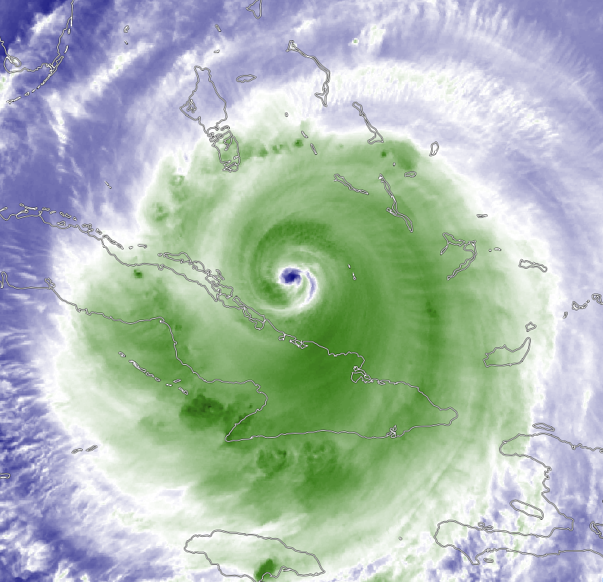 Para precipitación la misión por excelencia es GPM (global precipitation measurements). Diversos son los productos disponibles, pero el más usado es IMERG, un dato de tasa de precipitación capturada por la constelación de satélites que componen GPM. En este sitio se puede obtener una figura actualizada cada media hora. Pero se pueden descargar los datos y graficarlos en algún software como McIDAS-V. Para el caso de la figura, se ve que Irma tuvo tasas de precipitación cercanas a los 50 mm/h.