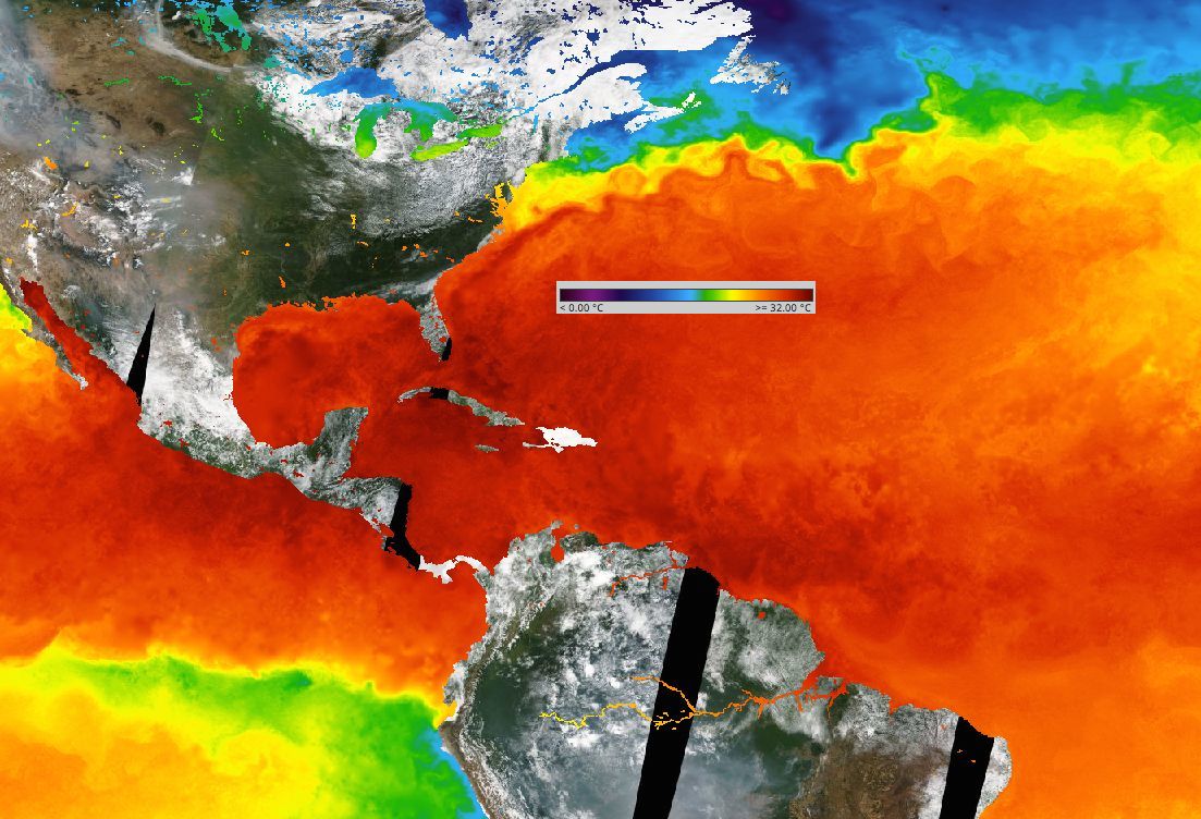 Por último, la que quizás es la principal variable que favorece el desarrollo de huracanes es la temperatura superficial del mar. Varias son las misiones satelitales que miden esto y se pueden conseguir en el sitio WorldView de NASA.