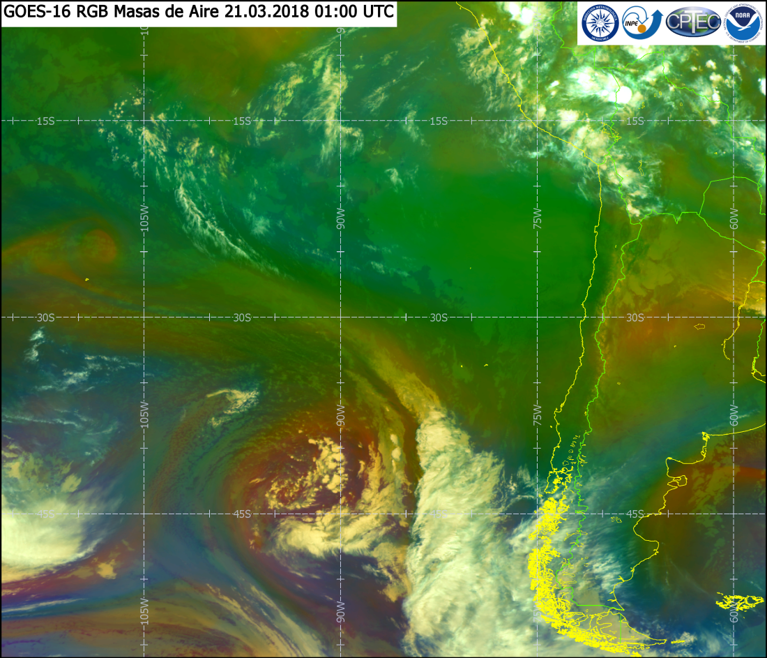 El RGB de Masas de Aire nos muestra dos cosas: primero la diferencia de masas de aire separadas por el frente. También si se fijan se ven unas bandas o franjas naranjas cerca de la baja presión, éstas son plegamientos de la tropopausa por presencia de corriente en chorro.