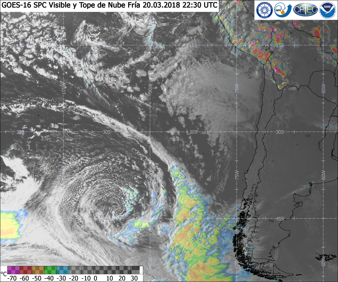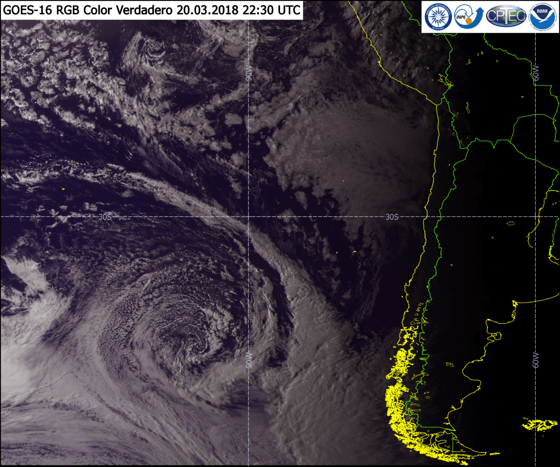 Belleza de ciclón extratropical. Imagen RGB de GOES-16 de Color Verdadero. Permite ver la presencia de nubes las que son evidentes en forma de espiral evidenciando la rotación del sistema. Tiene una banda principal pero cerca de la baja presión tiene bandas secundarias.