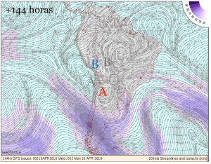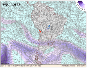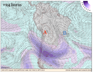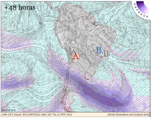 Las siguientes figuras muestran las salidas de GFS (corrida de hoy 10/04 a las 00 UTC) para flujo en 200 hPa. Las letras A y B coloreadas muestran la posición de la Alta y Baja en altura, respectivamente. La A y B en gris muestra la posición de las mismas 24 horas antes.