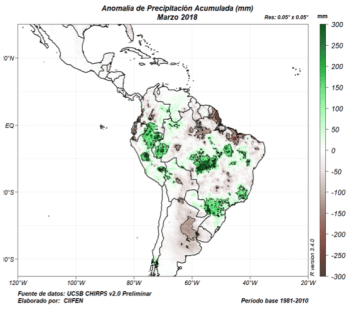 Se ven anomalías positiva de precipitación en Brasil (al noroeste de Bolivia) lo que parece estar continuando por estos días. Ahora, estas anomalías están hechas con datos CHIRPS que convengamos no son de lo mejor.