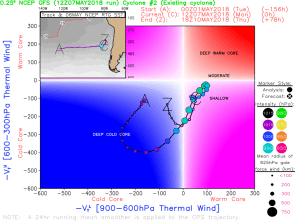 Justamente eso es lo que muestra el siguiente diagrama que muestra, según la dinámica del sistema, que tipo de núcleo tiene. Desde la posición inicial A con el ciclón con un centro frío, pasó a tener un centro cálido somero. Esta condición se relaciona también con sistemas que hacen una transición de sistemas de centro frío (extratropicales) a centro cálido (subtropicales).