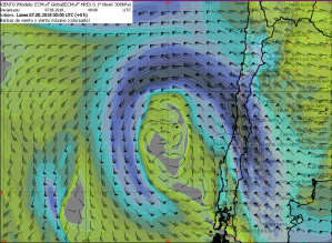Otra cosa que ha tenido este ciclón es que es muy estacionario. Y eso se puede explicar por la existencia de un hay un jet de barrera (de dirección norte) intenso en niveles medios -ver figura arriba de viento en 700 hPa- Este jet de barrera, que se genera por la interacción con la cordillera, hace que el sistema se haga lento. Pero también el jet o corriente en chorro a su alrededor está bien simétrico y por lo tanto el sistema no tiende a ir a ninguna parte, hasta que dicha simetría se rompa. Las siguientes figuras muestran que la magnitud del viento en la parte delantera y trasera del sistemas es prácticamente igual en altura.