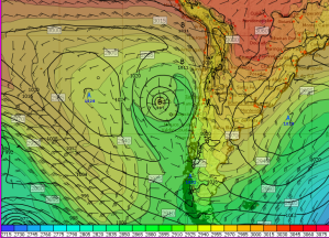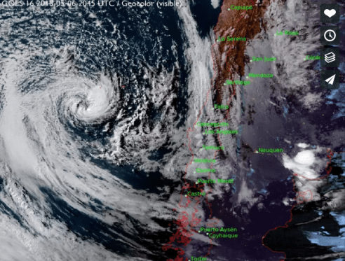 La siguiente animación, cortesía del colega Raúl Valenzuela del DGF, U. de Chile, muestra la evolución del sistema. Se puede que nació como un sistema extratropical, con un frente frío que se posicionó por delante orientado norte-sur. Con el paso de las horas el frente pasó y la baja presión quedó, haciendo circular el aire a su alrededor perdiendo la diferencia de masas de aire típica de los sistemas extratropicales.