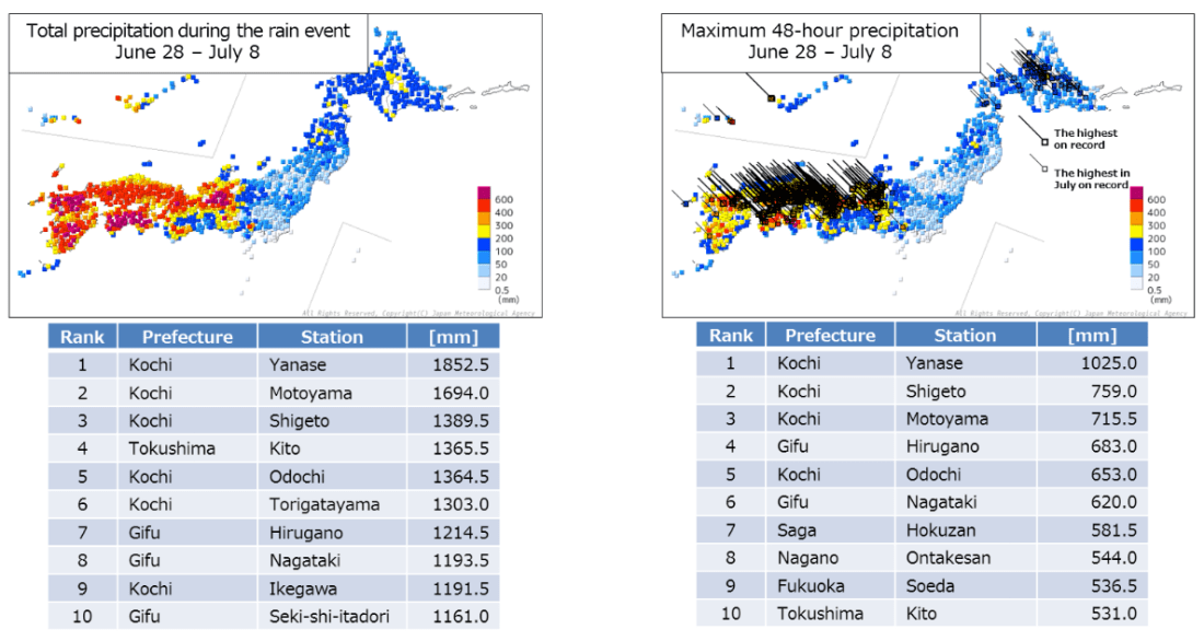 Entre los días 28 y 30 de junio, la circulación de una alta presión en el Pacífico norte favoreció una gran cantidad de flujo de vapor de agua sobre Japón (referencia en la imagen del día 28 como una elipse azul). Como se puede ver en la figura del día 28, desde el sur aproximaba a Japón una perturbación tropical, la que luego se transformaría en ciclón tropical, Prapiroon, la que aumentó dramáticamente el flujo de vapor, a valores por sobre los 1000 kg/m/s.