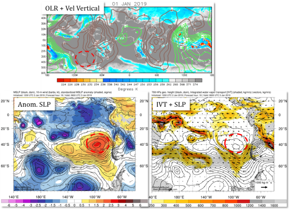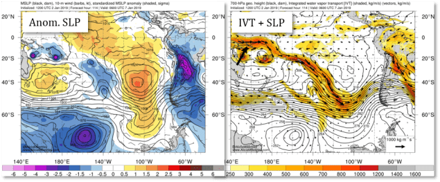 Esto es muy evidente en la hora 114 de pronóstico de GFS (7 de enero). En la figura de abajo se muestra ese momento en el pronóstico y se ve claramente una extenso flujo de humedad que conecta el Pacífico ecuatorial occidental con la costa de Sudamérica, evitando el Anticiclón del Pacífico.