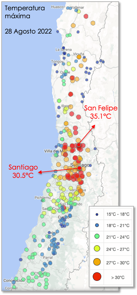 La siguiente figura muestra un mapa con las temperaturas máximas registradas el domingo 28 de agosto de 2022. Se puede ver que toda la zona central tuvo temperaturas muy altas, en muchos casos superando los 30°C. Nada de esto sería extraño si estuviésemos en verano, pero lo que siempre hemos sabido es que los inviernos son fríos. Entonces, ¿porqué un día se vuelve tan cálido y con un alza concentrada en los valles interiores?