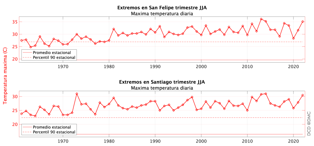 Para qué decir que todas estas temperaturas extremas superan el promedio inviernal para San Felipe (~20°C) y Santiago (~15°C), pero más importante es que estas temperaturas superan el percentil 90 de la distribución. Y es algo que pasa todos los años, al menos una vez (en San Felipe al menos desde 1980).