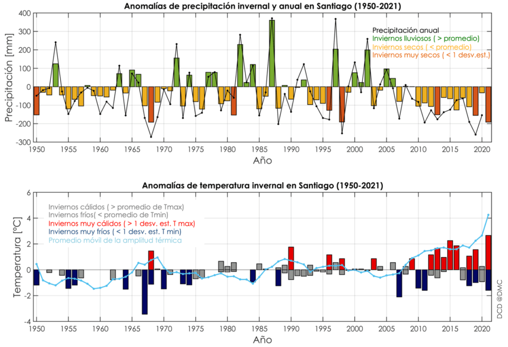 Los datos de Santiago muestran que además de hacerse muy secos los inviernos en los últimos años, también se han vuelto más cálidos. Es decir, la temperatura máxima es más alta de lo normal, pero también la temperatura mínima es más fría de lo normal y por eso la amplitud térmica muestra esa señal de ir aumentando en el tiempo. Parece ser un reflejo de una mayor cantidad de días despejados, no?. Pero también pueden haber otros procesos, como suelos más secos, entre otros (eso da para largo).