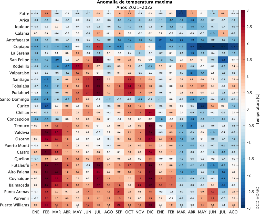 Este mapa de calor muestra las anomalías mensuales desde 2021 hasta la fecha. Si entre-cerramos los ojos y miramos la figura, se puede ver que desde marzo 2022 aproximadamente hubo un cambio de las fuertes anomalías positivas experimentadas en 2021 y las anomalías se volvieron negativas. ¿Cierto que se ve? Al menos para zona sur. Esto va muy de la mano con el aumento relativo de las precipitaciones este año. Cosa que ya discutimos hace poco en este blog. En el norte del país tamibén viven su mundo con la presencia de La Niña que ha mantenido todo este año las temperaturas bien por debajo los promedios. Pero la zona que nos interesa en esta oportunidad parece más variable.