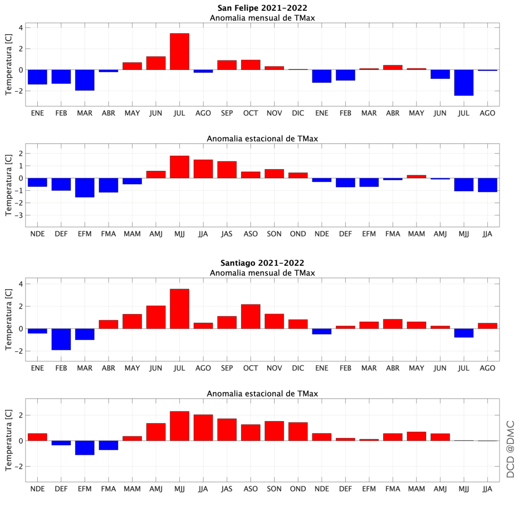 En San Felipe, tanto junio, julio (fuertemente!) y agosto tuvieron anomalías negativas (agosto hasta la fecha). Eso hace que el trimeste JJA esté con anomalías negativas. En Santiago es un poco más variable la cosa, y tanto junio como agosto han sido más cálidos de lo normal mientras que julio frio. Lo que hace que el trimestre JJA casi no tenga anomalías. Haciendo una mirada más amplia a Santiago, es como que el calor no se quisiera ir y casi todos los meses terminan con anomalías negativas (acaso efecto isla de calor?).