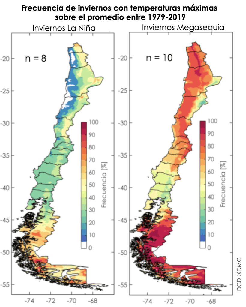 En cambio, durante la Megasequía es muy frecuente (>70%) que los inviernos sean cálidos en la zona central, cosa que se extiende al norte y sur ligeramente. Osea que de los 10 años de la Megasequía en el análisis (entre 2010 y 2019) 7 resultaron con el invierno más cálido de lo normal.