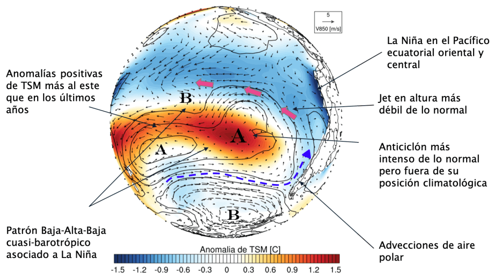 La presencia de La Niña, anomalías positivas de la presión, aunque ligeramente fuera de su posición climatológica y la persistente presencia de una zona cálida en el mar al Este de Australia pueden ser parte de las razones de porqué este invierno, a pesar de las lluvias registradas, terminó en general con números bajo los promedios (figura 4).