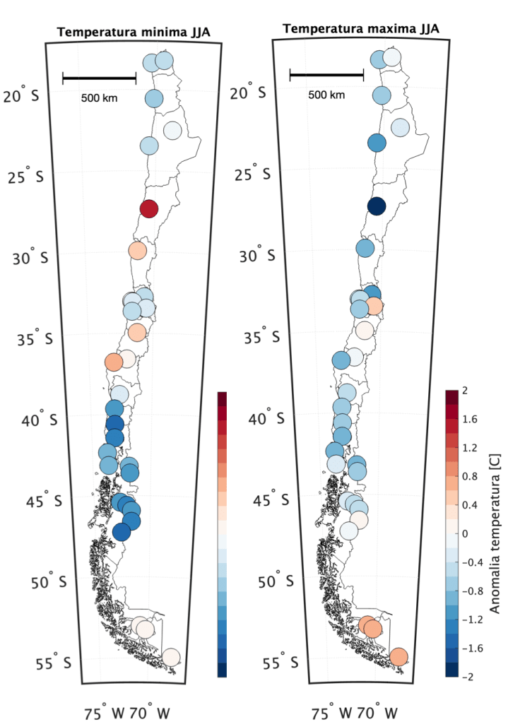 En cuanto a temperaturas, en general, fue un trimestre frío. Por un parte, la influencia de La Niña (ver figura 4) favoreció anomalías frías tanto de temperatura máxima como temperatura mínima en la costa del norte del país, mientras que el ingreso de masas de aire frío, por el sur, estuvieron asociadas a una importante disminución de las temperaturas mínimas (y también máximas) en el tramo entre Biobío y Aysén.