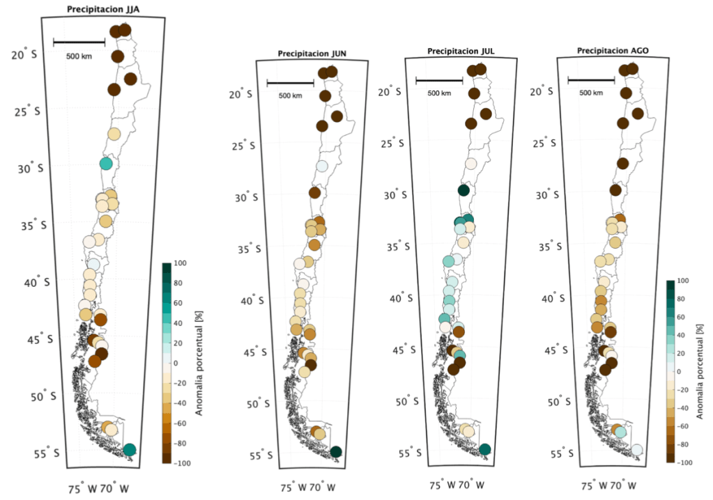 Más al sur, en Coyhaique, el déficit invernal alcanzó un 27%. Los meses invernales estuvieron bajo los promedios climatológicos con 114, 72.7 y 85.6 mm acumulados en junio, julio y agosto, respectivamente, mientras que las normales son 390, 259 y 272 mm.